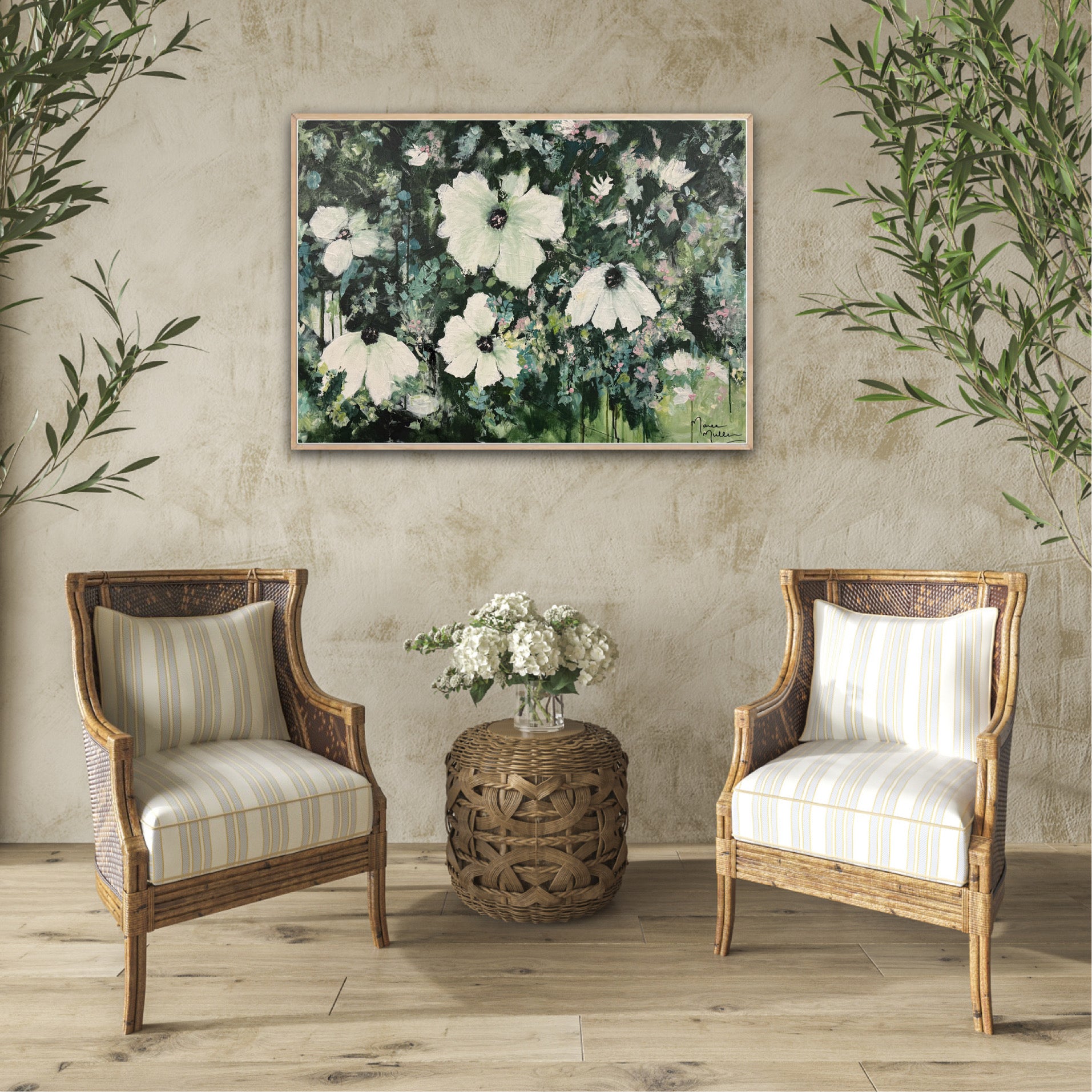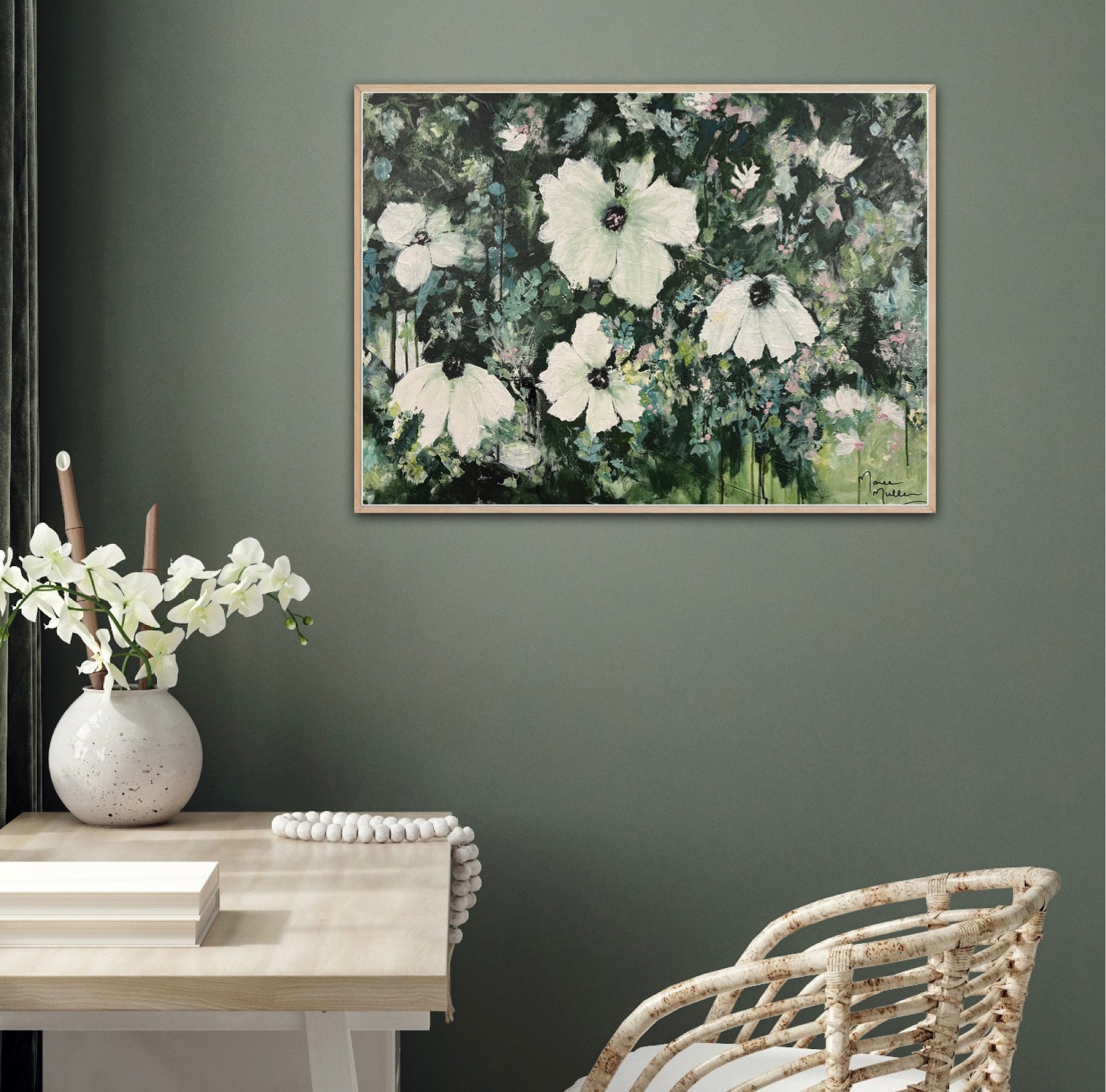 Created using various shades of green and white on stretched canvas. Measures 100cm wide x 75 cm long 1.5cm deep.